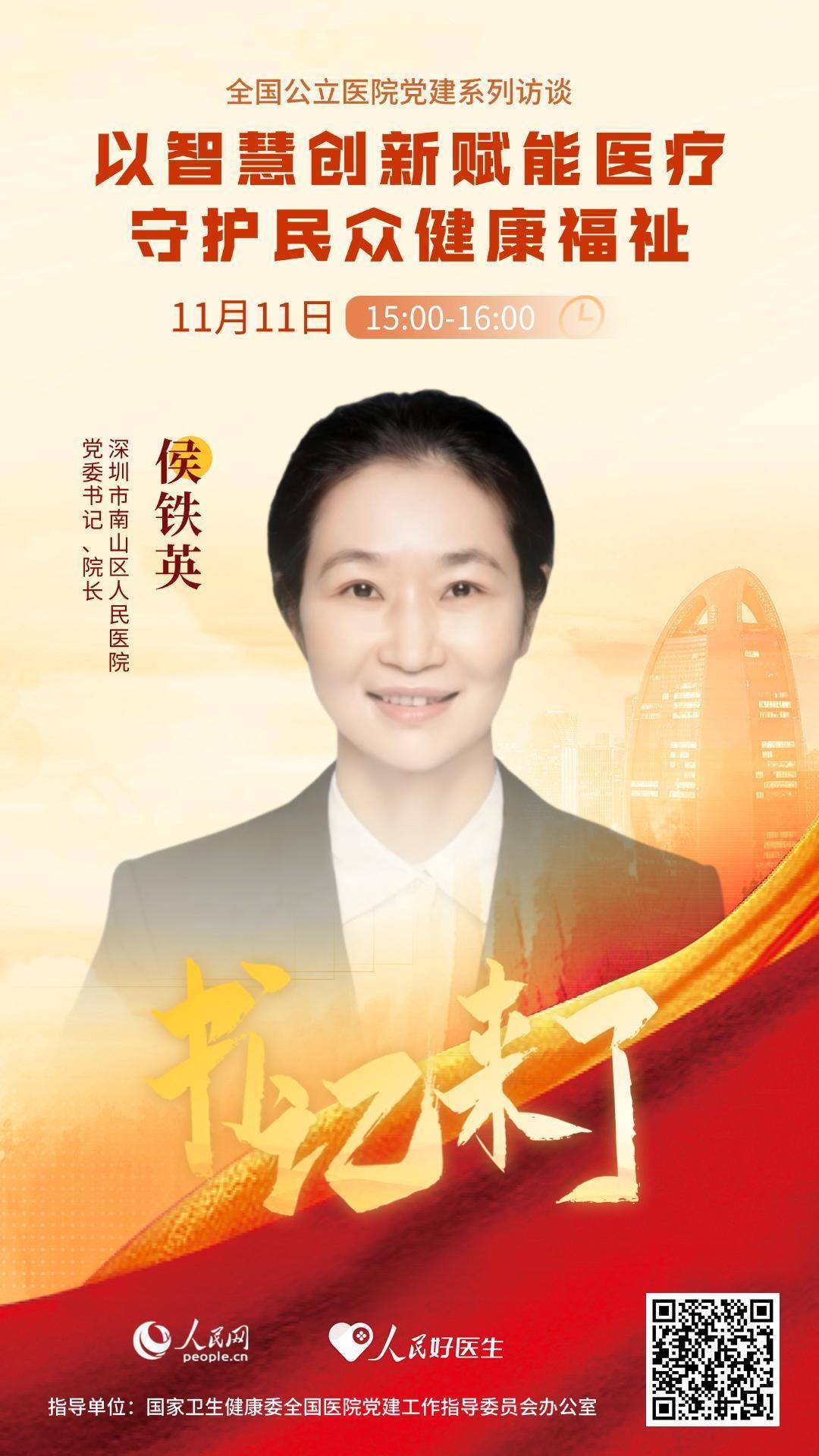 公立医院如何通过党建引领促进学科发展,助力医疗服务质量提升?11月11日15:00至16:00,深圳市南山区人民医院党委书记、院长侯铁英将做客《书记来了》,与大家分享医院在加强党建、推动智慧医院建设以及促进医院高质量发展等方面的经验和做法,敬请关注。
